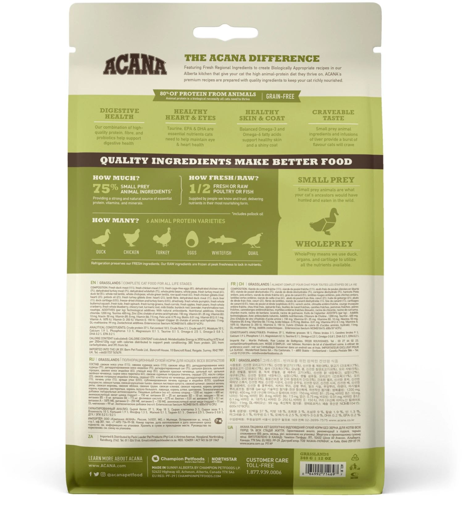 Acana Grasslands cuenta con grandes cantidades de pollo, pavo y pato criados en libertad, huevos frescos de corral y pescado capturado en la naturaleza, incluyendo carne, órganos, cartílagos y huesos. Nuestros ingredientes llegan a nuestra cocina frescos o crudos de la mano de personas que conocemos y en las que confiamos, para elaborar una dieta completa, sana y equilibrada para todas las razas y edades.