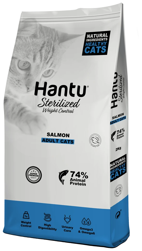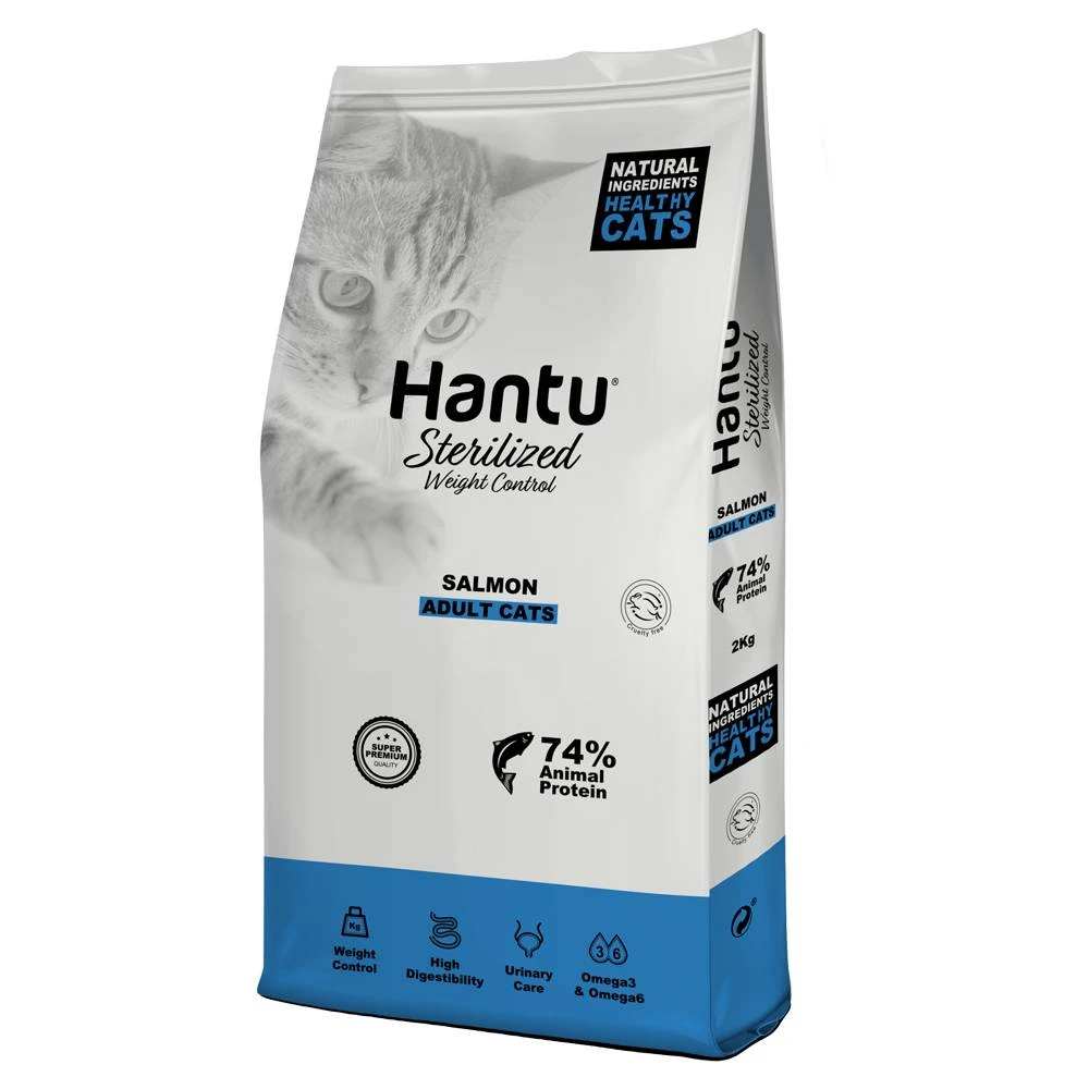 Elaborado con ingredientes naturales de primera calidad, Hantu Adult Sterilized es un pienso premium que le aportará a tu gato una alimentación completa y equilibrada proporcionándole todos los nutrientes necesarios gracias a su alto contenido en salmón (30%).