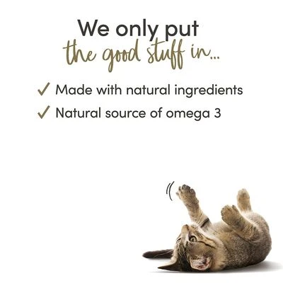 Los filetes de pescado proceden de fuentes sostenibles, y la carne de pollos de corral criados sin hormonas ni antibióticos. Applaws en gelatina contiene taurina y arginina naturales, aminoácidos esenciales para la salud de los gatos. Applaws en gelatina no contiene cereales, por lo que es adecuado para gatos sensibles.