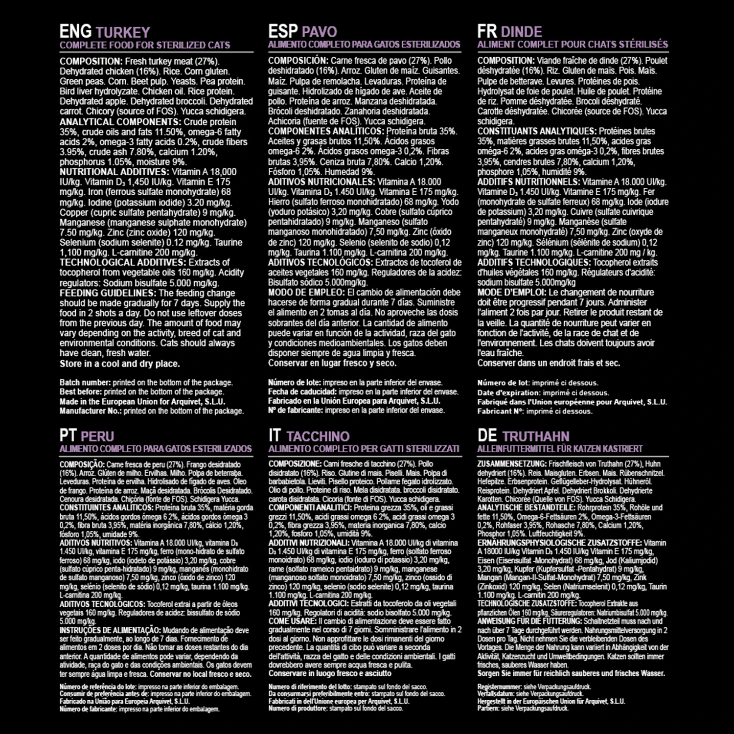 Alimento completo y equilibrado, para gatos esterilizados u obesos de cualquier raza en fase adulta, a base de carne fresca de pavo. Las proteínas de pavo, bajo en grasas, proporcionan la energía necesaria con un nivel de actividad normal. Con ácidos grasos esenciales que reducen la formación de las perjudiciales bolas de pelo y protegen su sistema urinario. COMPOSICIÓN: Carne fresca de pavo (27%). Pollo deshidratado (16%). Arroz. Gluten de maíz. Guisantes. Maíz. Pulpa de remolacha. Levaduras. Proteína de guisante. Hidrolizado de hígado de ave. Aceite de pollo. Proteína de arroz. Manzana deshidratada. Brócoli deshidratado. Zanahoria deshidratada. Achicoria (fuente de FOS). Yucca schidigera. COMPONENTES ANALÍTICOS: Proteína bruta 35%. Aceites y grasas brutos 11,5%. Ácidos grasos omega-6 2%. Ácidos grasos omega-3 ,2%. Fibras brutas 3,95%. Ceniza bruta 7,8%. Calcio 1,2%. Fósforo 1,5%. Humedad 9%. ADITIVOS NUTRICIONALES: Vitamina A 18. UI/kg. Vitamina D3 1.45 UI/kg. Vitamina E 175 mg/kg. Hierro (sulfato ferroso monohidratado) 68 mg/kg. Yodo (yoduro potásico) 3,2 mg/kg. Cobre (sulfato cúprico pentahidratado) 9 mg/kg. Manganeso (sulfato manganoso monohidratado) 7,5 mg/kg. Zinc (óxido de zinc) 12 mg/kg. Selenio (selenito de sodio) ,12 mg/kg. Taurina 1.1 mg/kg. L-carnitina 2 mg/kg. ADITIVOS TECNOLÓGICOS: Extractos de tocoferol de aceites vegetales 16 mg/kg. Reguladores de la acidez: Bisulfato sódico 5.mg/kg. MODO DE EMPLEO: El cambio de alimentación debe hacerse de forma gradual durante 7 días. Suministre el alimento en 2 tomas al día. No aproveche las dosis sobrantes del día anterior. La cantidad de alimento puede variar en función de la actividad, raza del gato y condiciones medioambientales. Los gatos deben disponer siempre de agua limpia y fresca. Conservar en lugar fresco y seco.