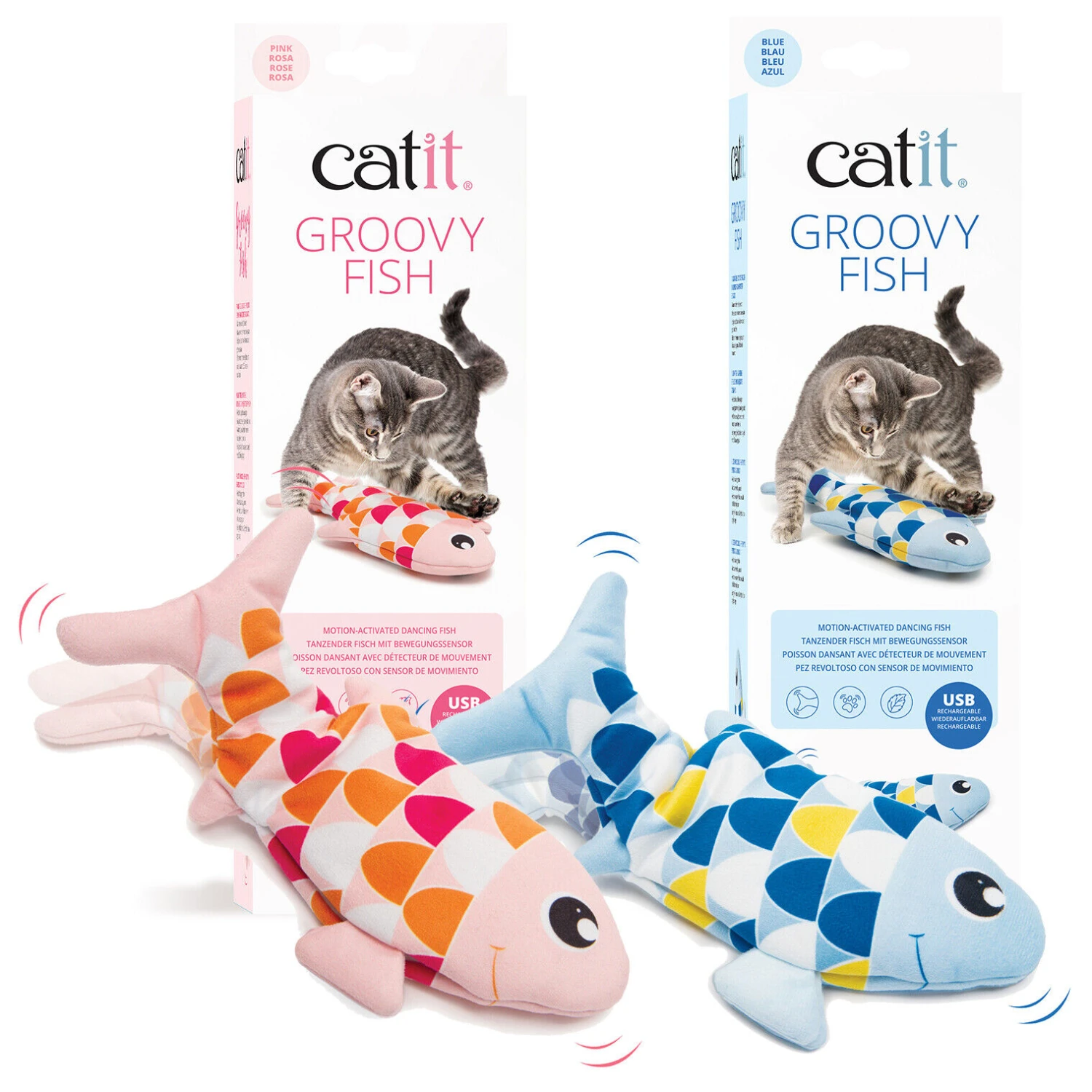 El Catit Groovy Fish está disponible en rosa y azul. Su adorable diseño gráfico se ha impreso en materiales seguros para gatos, utilizando tecnología ecológica.