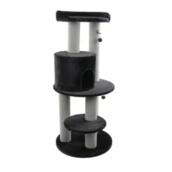 Ahora bien, imagina un árbol rascador que, además, viene con una zona de masajes. ¡Accesorio irresistible! La primera planta está forrada de felpa suave y confortable, mientras que la segunda tiene un poste de sisal con una pelota colgante en forma de cascabel. ¿Lo distintivo de este modelo? Un arco tipo puente con púas de caucho para que tu gato pueda frotarse al pasar por debajo. ¡Le fascinará!