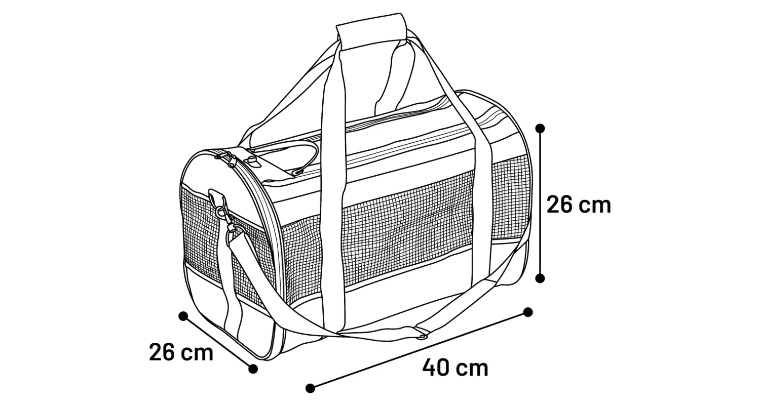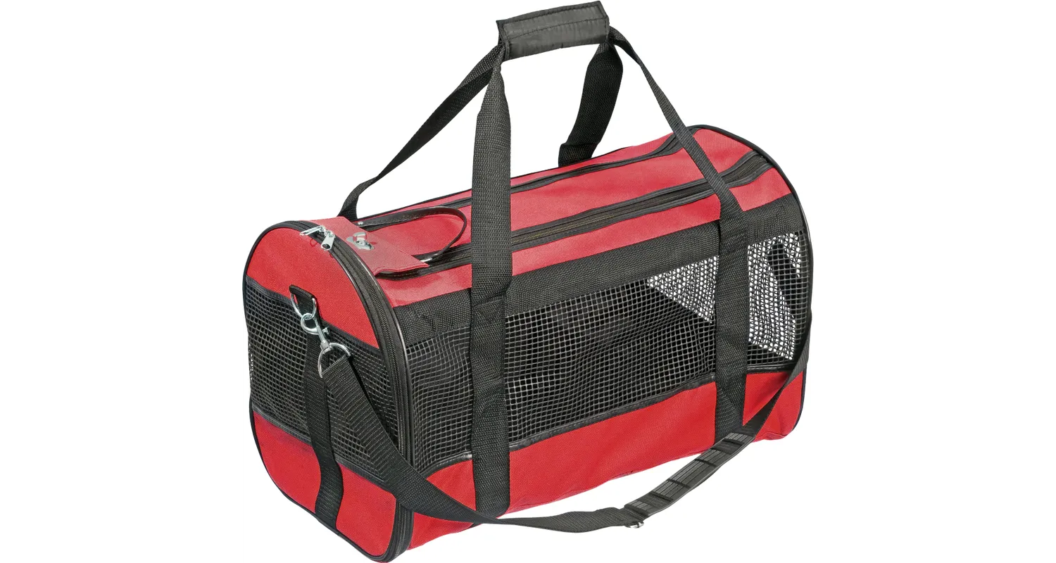 Práctico transportin de nylon, totalmente plegable. Contiene dos aperturas, una frontal y otra superior. Con todos los laterales de rejilla para una mejor comodidad de su mascota. Color rojo