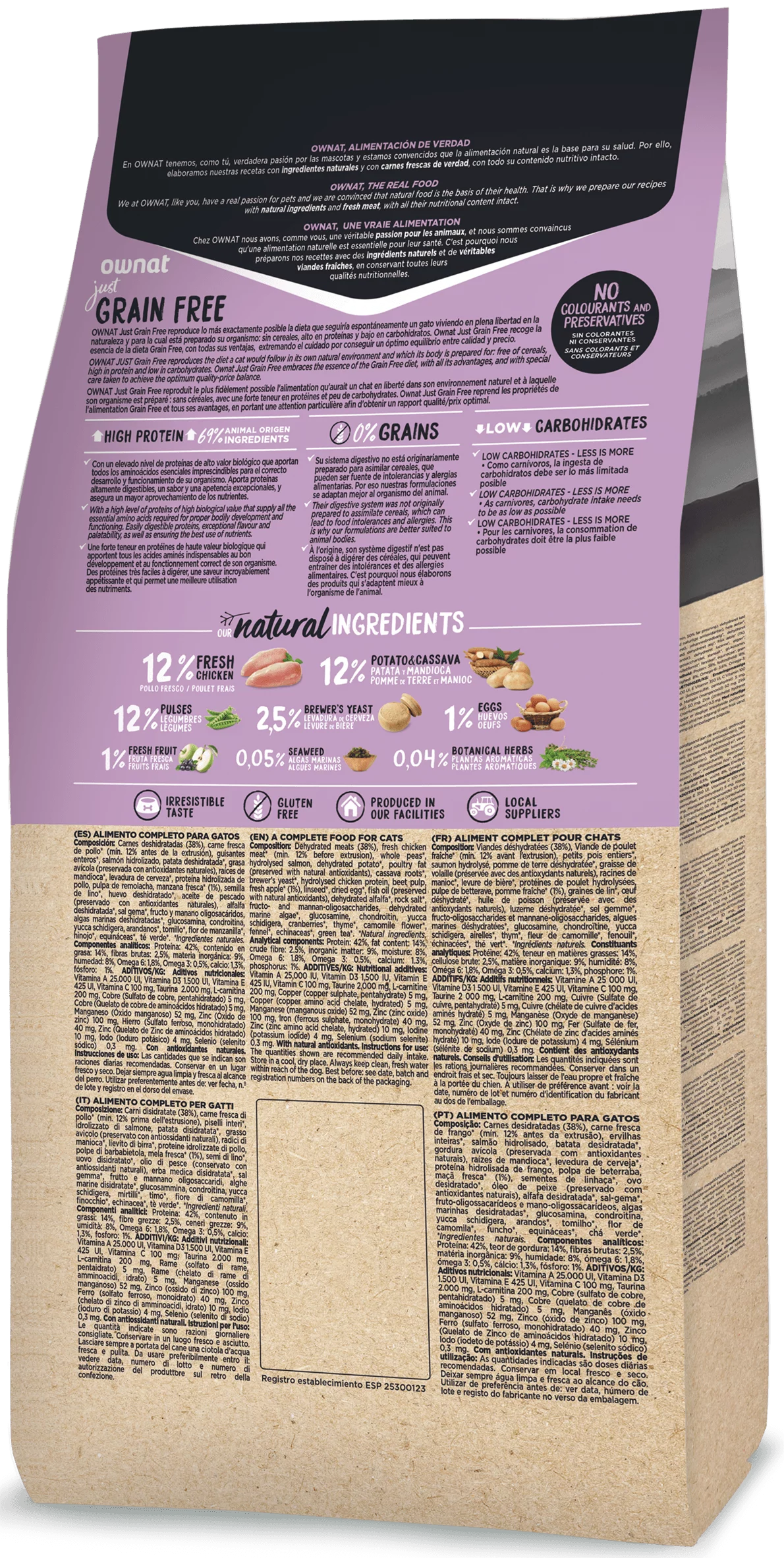 Ownat Just Grain Free recoge la esencia de la dieta Grain Free (sin cereales, alta en proteínas y baja en carbohidratos) con todas sus ventajas, extremando el cuidado por conseguir un óptimo equilibrio entre calidad y precio.