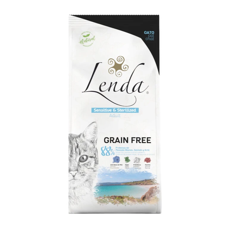 ¡Tu felino adulto esterilizado podrá alimentarse tranquilamente sin sufrir de alergias y sin aumentar su peso con el delicioso pienso de pescado blanco Sensitive & Sterilized de Lenda!