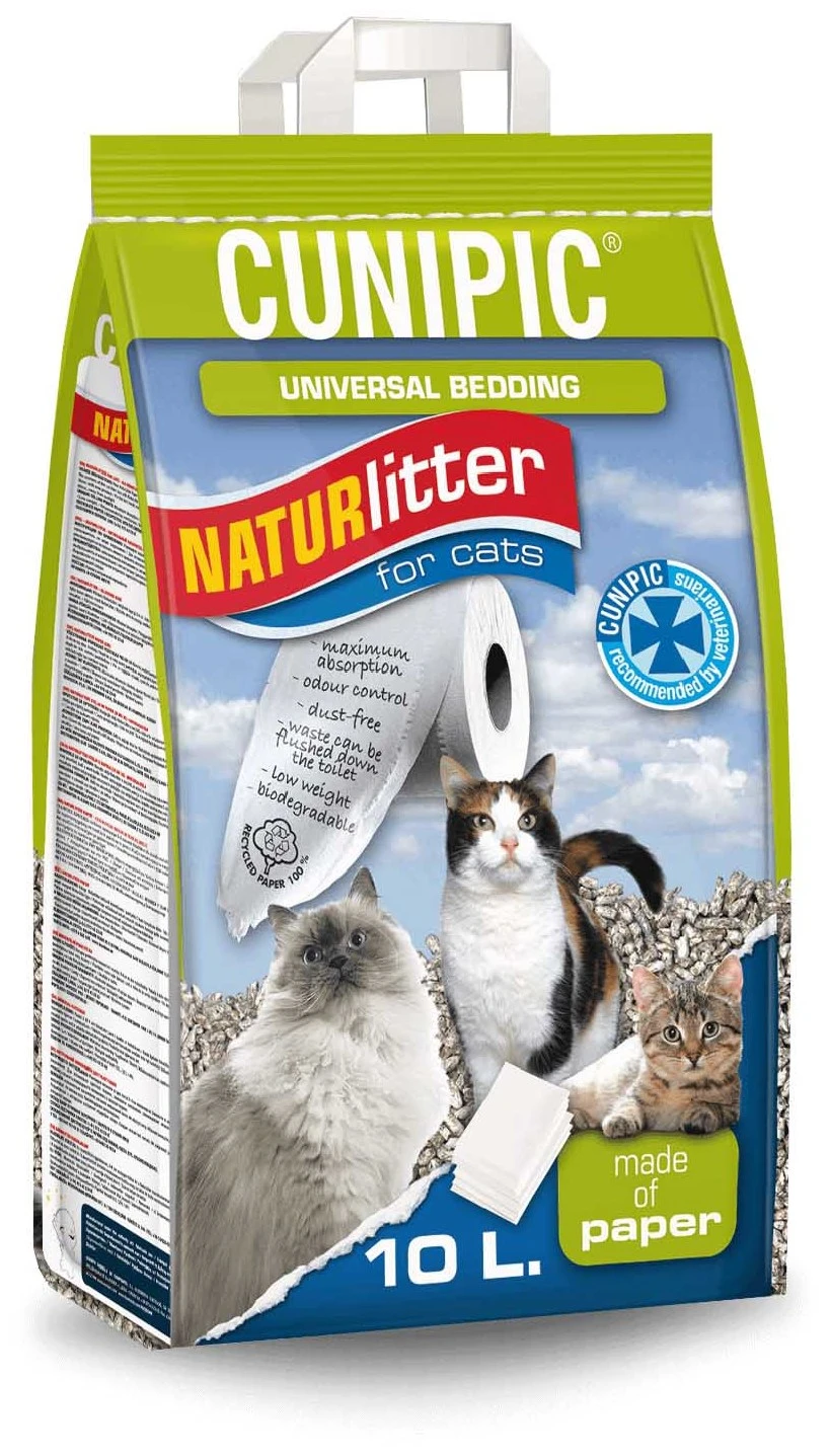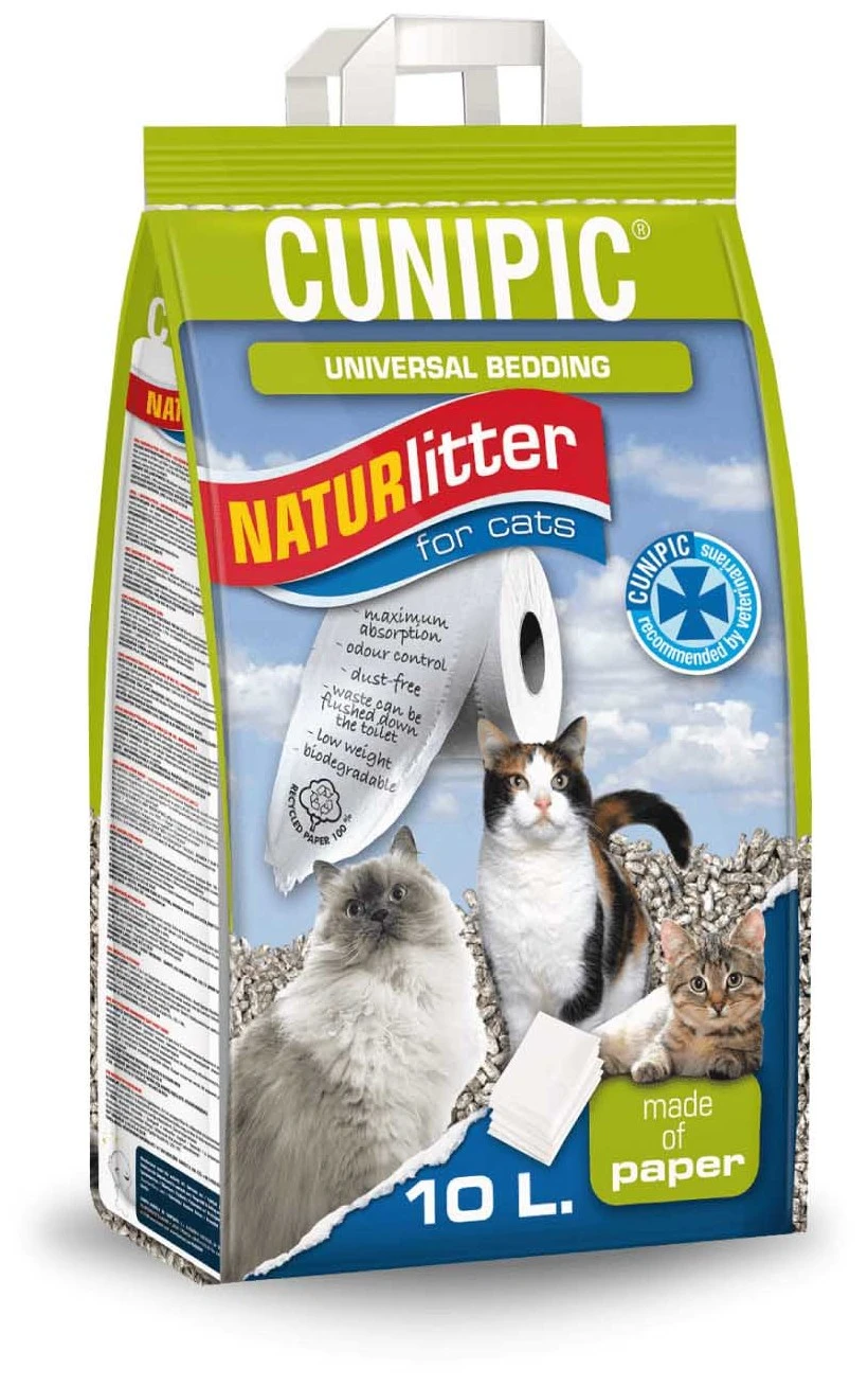 Cunipic Naturlitter papel para gatos está fabricado únicamente con materiales naturales y respetuosos con el medio ambiente. Sin sustancias químicas. Además es biodegradable. Una buena forma de cuidar de la tierra y de tu gato a la vez.