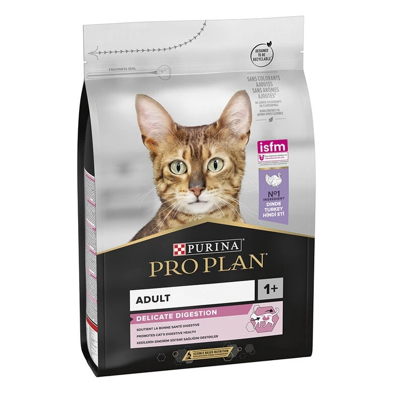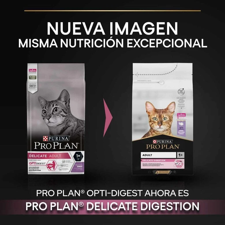 Con el pienso Purina Pro Plan Delicate Digestion los gatos mejoran sus digestiones y se animan a comer, gracias a la cantidad de pavo que contiene, además protege la función renal y el sistema inmunitario.