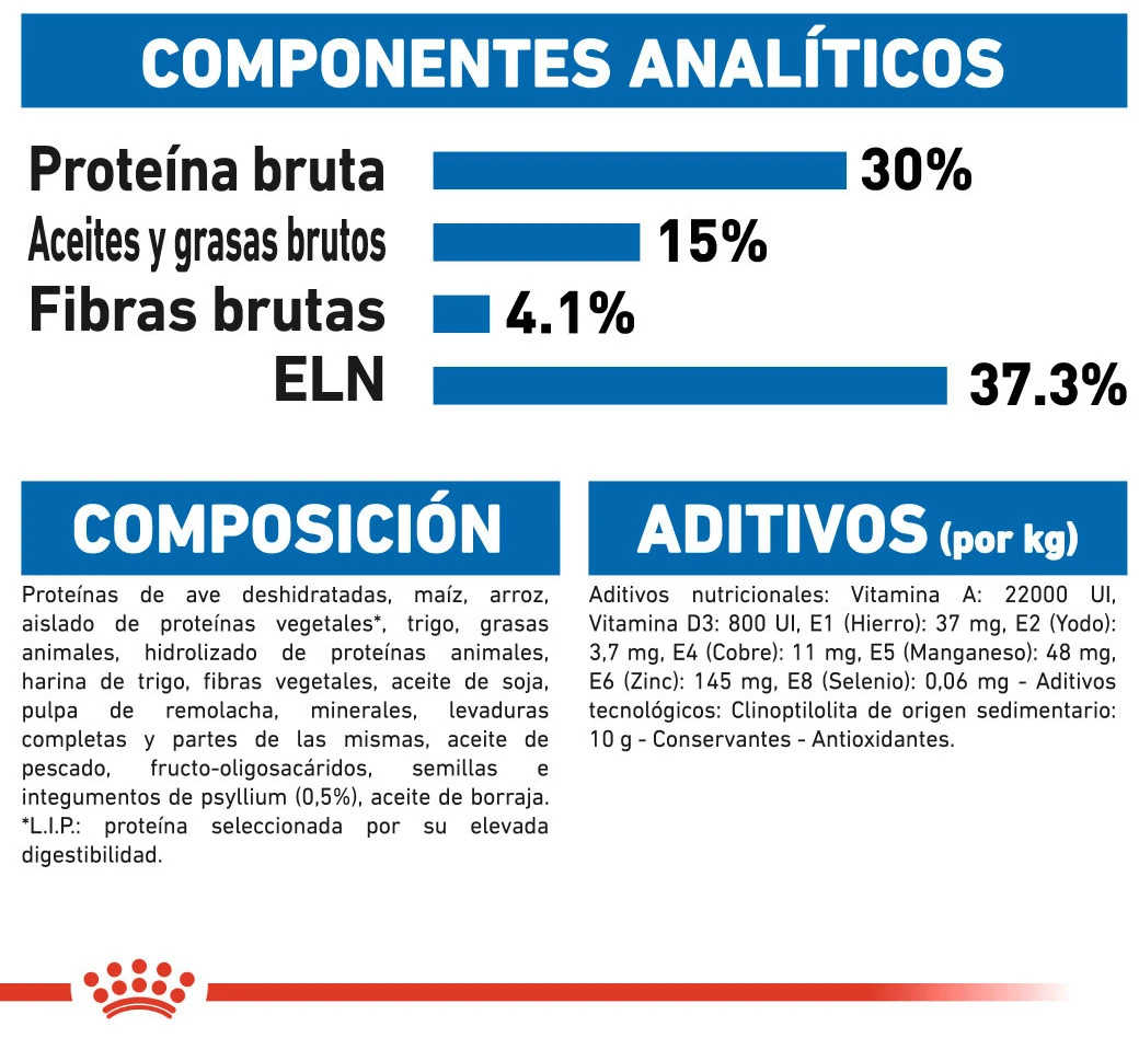 Composición: Proteínas de ave deshidratadas, maíz, arroz, aislado de proteínas vegetales*, trigo, grasas animales, hidrolizado de proteínas animales, harina de trigo, lignocelulosa, aceite de soja, pulpa de remolacha deshidratada, minerales, levaduras completas y partes de las mismas, aceite de pescado, fructo-oligosacáridos, semillas e integumentos de zaragatona (0,5 %), aceite de borraja. *Proteínas L.I.P.: proteínas seleccionadas por su elevada digestibilidad. Aditivos: Aditivos nutricionales: Vitamina A (22 000 UI/kg), vitamina D3 (800 UI/kg), E1 [hierro] (37 mg/kg), E2 [yodo] (3,7 mg/kg), E4 [cobre] (11 mg/kg), E5 [manganeso] (48 mg/kg], E6 [zinc] (145 mg/kg), E8 [selenio] (0,06 mg/kg). Aditivos tecnológicos: Clinoptilolita de origen sedimentario (10 g/kg). Conservantes, antioxidantes.