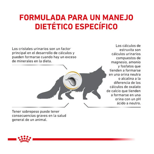 Es un alimento dietético para gatos perfecto para la disolución de los cálculos de fosfato inorgánico. Reduce la probabilidad de que estos vuelvan a aparecer. Además, se puede utilizar para tratar la enfermedad de las vías urinarias.