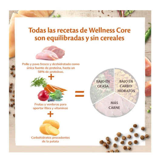 ¡A tu felino adulto le encantará el delicioso pienso de Wellness Core con sabor a pollo y pavo!